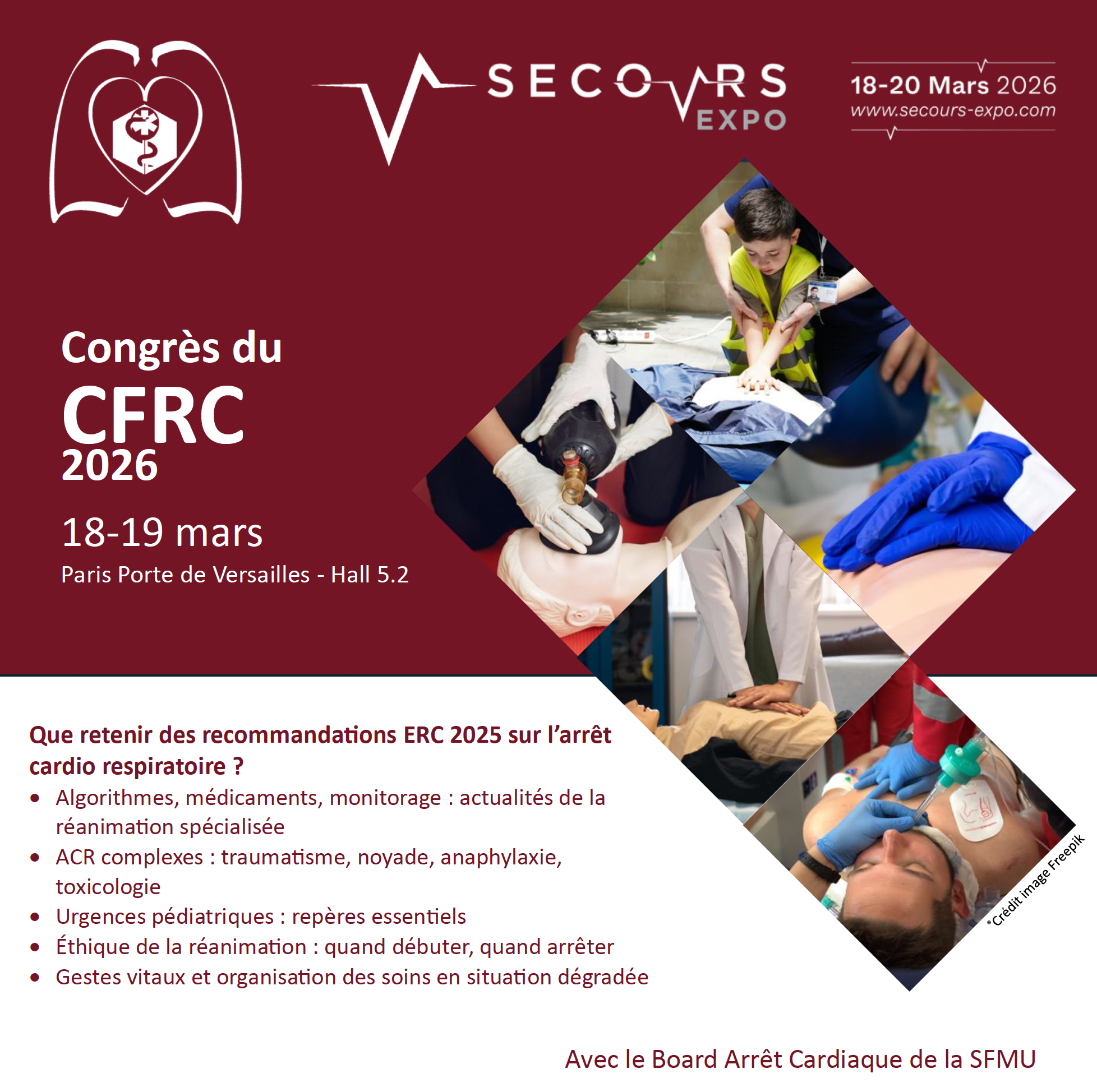 18–19 mars 2026 Lieu : Paris – Parc des Expositions, Porte de Versailles (Hall 5.2) Public visé : Professionnels de la réanimation, de l'arrêt cardiaque, urgentistes, secouristes, paramédicaux, formateurs en RCP.